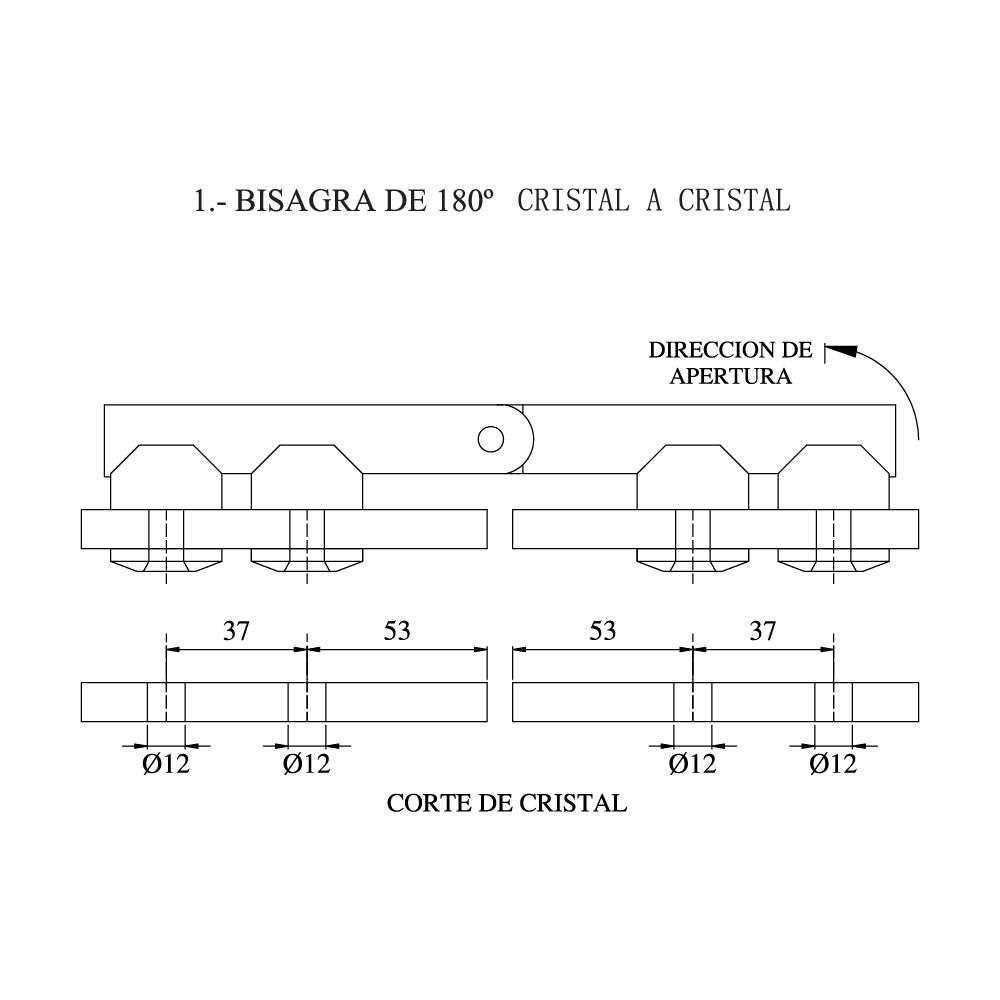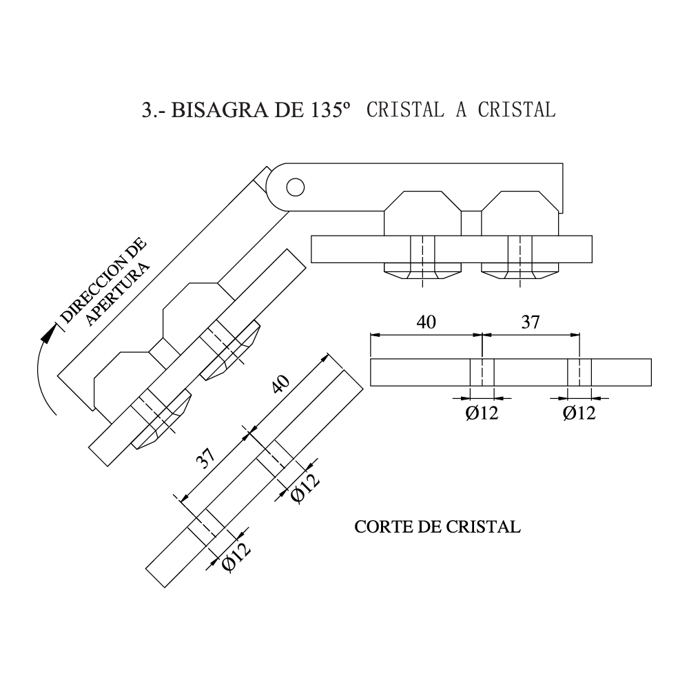 Bisagra de 90°, 135° y 180° cristal a cristal